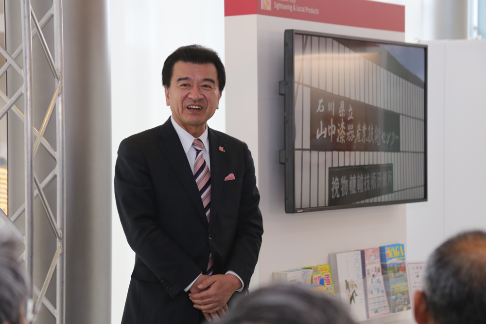 3月24日(木曜日)、市役所1階の一角を覆っていた大きな白い布が取り払われ、新たなコーナーが姿を現しました。その名も「野々市市観光物産協会展示コーナー」。市の観光を盛り上げるべく設置されたこのコーナーは、市役所正面玄関から入ってすぐ、カメリア側の階段横にあります。