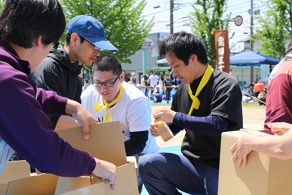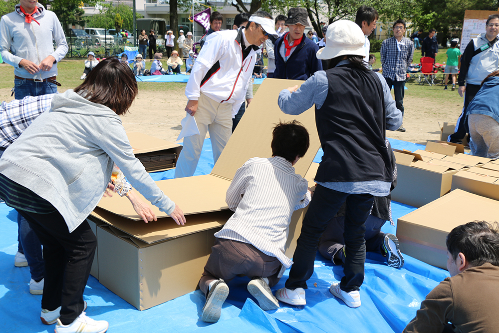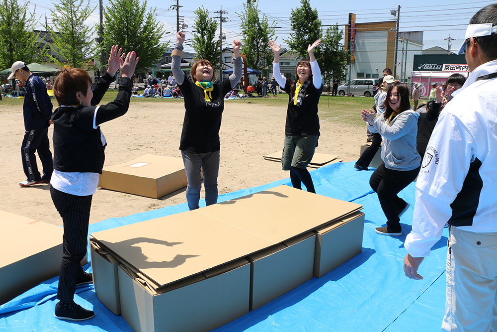 5月7日(日曜日)に開催された第39回粟田町内運動会で、災害時に使用する段ボールベッドを用いた防災競技が行われました。「イベントの一部として楽しみながら防災を学んでほしい」という主催者の思いから、今回初めて防災競技を取り入れました。
